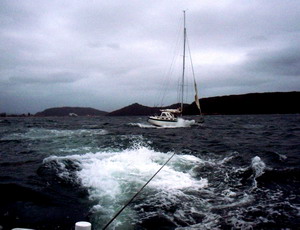 "The rescue boat crew got a line aboard the yacht and began a tow towards Pittwater. "Progress was slow because of the strong southerly and the wind in the jammed sail.