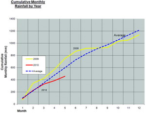 The total for the year stands at 456.9mm, about 25 per cent below the year-to-date average at the end of May of 596.5mm.