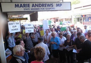 A newly-formed group of Central Coast residents has protested again proposed coastal protection legislation outside the Woy Woy office of Member for Gosford Ms Marie Andrews.