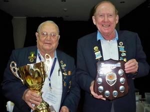 Pictured: Bert Dodd, National, NSW and Central Coast President of the Past Presidents Associations holding the Mixed Fours Perpetual Trophy with Peter Arnold, Coordinator, holding the Gordon Charlton Shield.