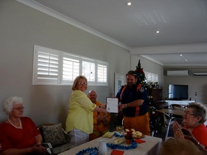 The Cove Retirement Village in Daleys Point received a visit from Captain Rob Stirling of the Kariong branch of the NSW Rural Fire Service (RFS) on Saturday, December 7, to present a Certificate of Appreciation for monies donated to the branch recently.